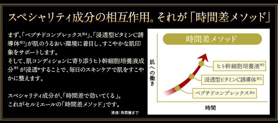 ※1 ヒト幹細胞順化培養液(保湿成分) ※2 ヒト脂肪由来間葉系細胞エクソソーム(整肌成分) ※3 リン酸アスコルビルMg、アスコルビルグルコシド(すべて整肌成分)、 ※4 パルミトイルトリペプチド-5、パルミトイルジペプチド-5ジアミノヒドロキシ酪酸、パルミトイルジペプチド-5ジアミノブチロイルヒドロキシトレオニン、アセチルヘキサペプチド-8、ジ酢酸ジペプチドジアミノブチロイルベンジルアミド、アスコルビルメチルカルボニルペンタペプチド-72-トリ-t-ブチルトリプトファナミド(すべて整肌成分)
